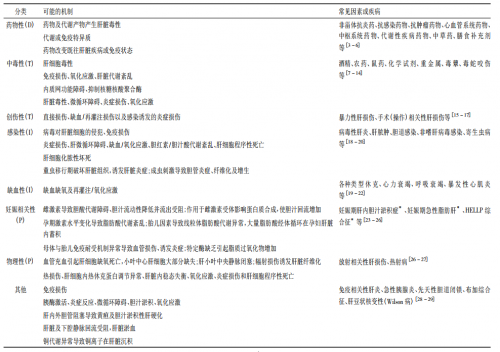 临床中可以诱发ALI的因素繁多,从病因学角度对ALI进行分类,可将ALI分为药物性肝损伤(drug-induced liver injury,DILI)、中毒性肝损伤(toxin-induced liver injury) ,创伤性肝损伤(trauma-induced liver injury) 、感染性肝损伤(infection-induced liver injury) 、缺血性肝损伤(ischemic-induced liver injury,ILI)、妊娠相关性肝损伤(pregnancy-associated liver injury,PALI)、物理性肝损伤(physical agents-induced liver injury)及其他肝损伤。