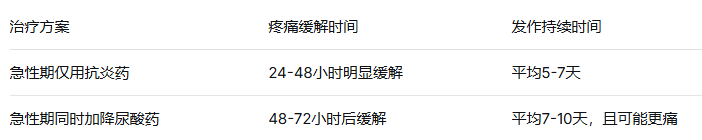 急性期通常持续5-7天。待关节红、肿、热、痛完全消失后(约2周),应启动长期降尿酸治疗,目标是将血尿酸控制在<360μmol/L(有痛风石者<300μmol/L)。