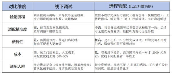 纠结线上线下的本质,其实是纠结 “远程验配能不能替代线下调试”。我带着我爸分别体验了线下门店调试和西万博的远程验配,两者的差异和适配人群,一张表就能看明白: